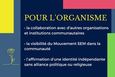 De plus, au fil des ans et de l’expérience acquise, un code d’éthique s’est peu à peu imposé de lui-même à toute l’équipe du Mouvement SEM, c’est–à–dire au conseil d’administration, à la direction, au personnel de tous les services et aux bénévoles.